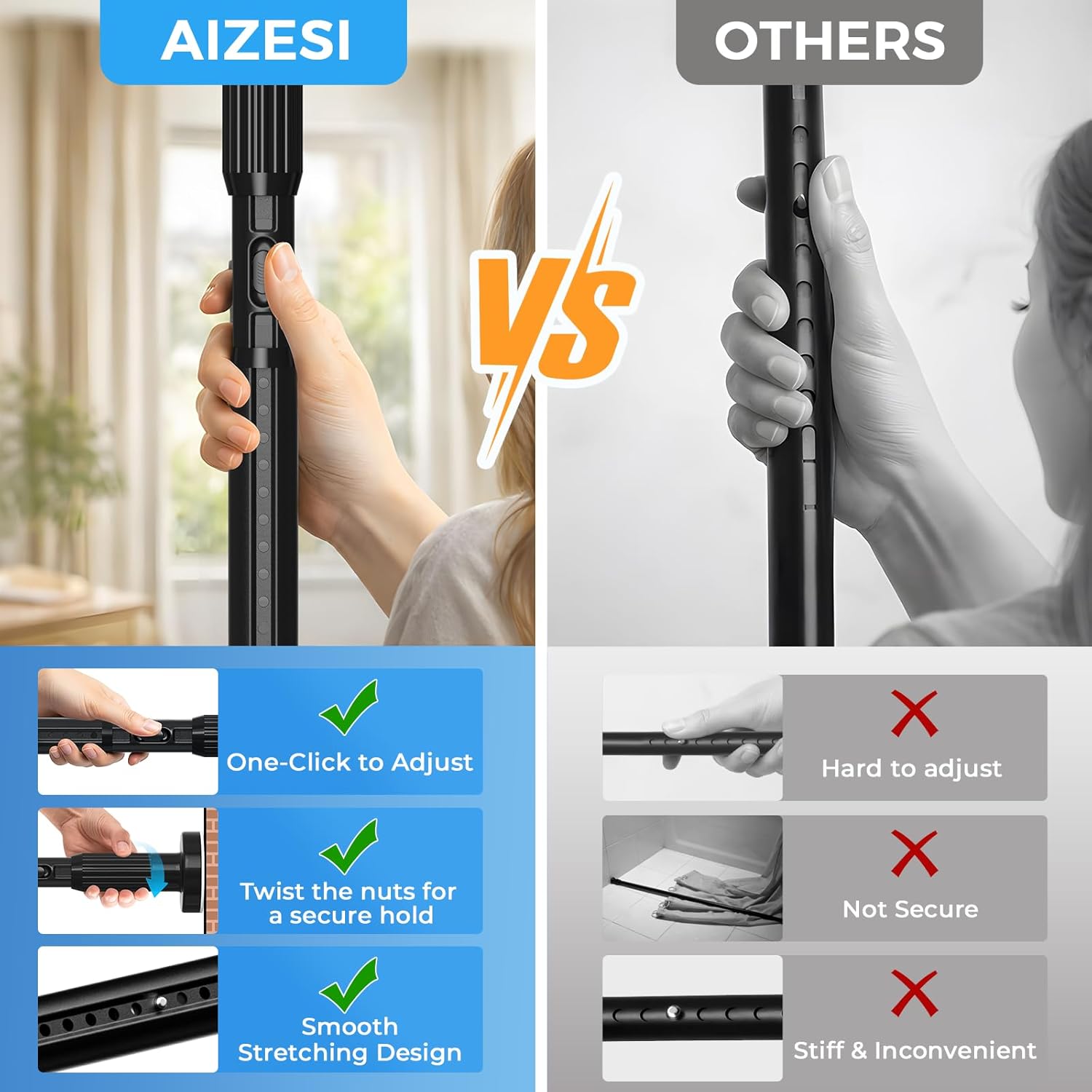 AIZESI 41-144 Inch Heavy Duty Black Tension Curtain Rod – No Drilling, Adjustable, Rust-Resistant for Outdoor, Living Room, Window, Bathroom