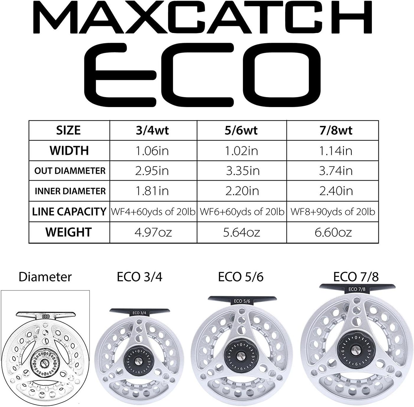 Introducing the M MAXIMUMCATCH Maxcatch ECO Large Arbor Fly Fishing Reel, the perfect companion for anglers seeking performance and sustainability. Designed for versatility, this reel accommodates 3/4wt, 5/6wt, and 7/8wt lines, making it ideal for a variety of fishing conditions.