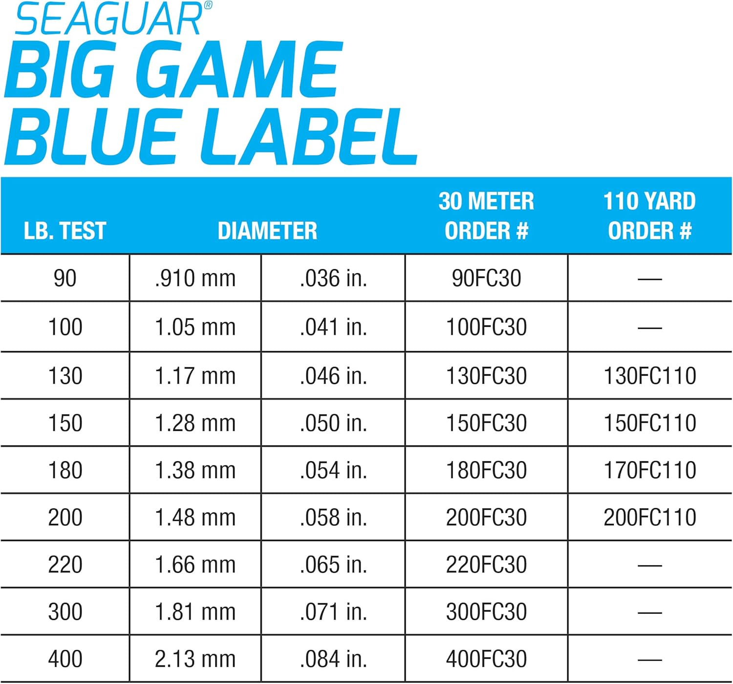 Seaguar Blue Label Big Game Saltwater Fishing Leader Line, 100% Fluorocarbon, 30meter, Clear, Multiple Sizes
